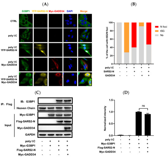 We know that the SARS2-N protein switches tSGs to N+foci by reshaping the interactome of G3BP1. Furthermore, we investigated whether GADD34 affected the interaction between SARS2-N and G3BP1 using a co-immunoprecipitation assay. As shown in Figure 4C,D, the interaction between SARS2-N and G3BP1 was observed after the treatment of poly I:C, while GADD34 did not affect their interaction. Collectively, these findings suggest that GADD34 has a negligible influence on the formation of N+foci and acts independently of or downstream of SG remodeling events to modulate innate immunity.