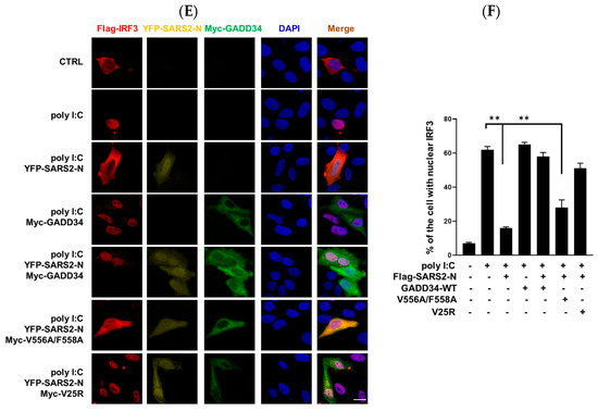 We have shown that GADD34 promotes the nuclear translocation of IRF3 (Figure 3E,F). We next performed immunofluorescence assays to investigate whether GADD34 regulates the nuclear translocation of IRF3 depending on the 555KVRF559 motif. As illustrated in Figure 5E,F, SARS2-N protein significantly inhibited nuclear translocation of IRF3 induced by poly I:C. Either wild-type GADD34 or V25R effectively overcame these inhibitions by the SARS2-N protein, while V556A/F558A failed to recover the nuclear import of IRF3 (Figure 5E,F). Taken together, this indicates that GADD34 antagonizes SARS2-N protein-mediated suppression of innate immune response dependent on the 555KVRF559 motif.