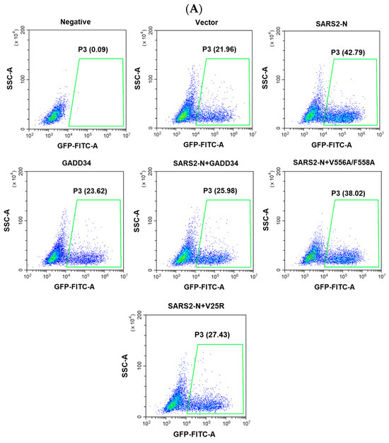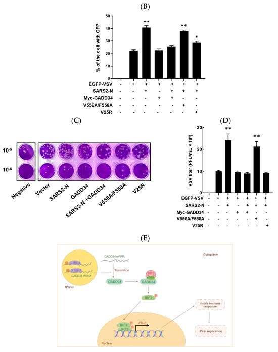 Our previous studies showed that SARS2-N facilitates viral replication by suppressing innate immunity [33]. Here, we utilized VSV-GFP as a model virus to investigate whether GADD34 may play a role in regulating viral replication through antagonizing the SARS2-N-mediated innate immunosuppression. Consistent with our previous studies, flow cytometry showed that the expression of SARS2-N markedly elevated the percentage of GFP-positive cells (Figure 6A,B). The expression of either the wild-type GADD34 or V25R mutant led to a notable decrease in the proportion of GFP-positive cells. However, the V556A/F558A mutant, which is deficient in inducing nuclear translocation of IRF3, failed to inhibit the replication of VSV-GFP, as there was no significant difference in the percentage of VSV-GFP in V556A/F558A-expressing cells compared to that in SARS2-N transfected cells. In addition, a viral plaque assay conducted in SARS-CoV-2-susceptible Vero-E6 cells showed that the VSV-GFP titer in the supernatant of cells expressing SARS2-N protein was significantly higher than that of the control group. Co-expression of wild-type GADD34 or V25R but not V556A/F558A reduced viral replication stimulated by the SARS2-N protein (Figure 6C,D). Collectively, these results demonstrate that GADD34 antagonized viral replication facilitated by the SARS2-N protein dependent on the KVRF motif, which may be due to the antagonistic action of the GADD34 and SARS2-N protein in the modulation of innate immunity.