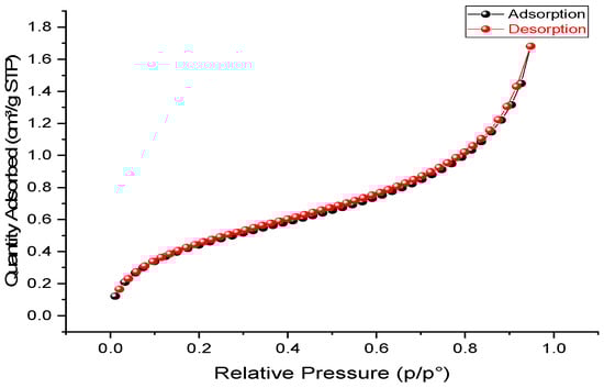 Figure 1 illustrates the N2 adsorption–desorption isotherm of Z. Gaetulum stem powder. According to the IUPAC classification, it is distinctly assigned to type IV with a negligible H3 hysteresis loop. This evidence corroborates the mesoporous nature of our biosorbent.