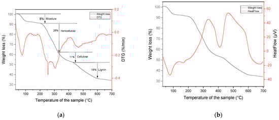 Finally, lignin is more thermally stable than cellulose and hemicellulose and decomposes over a wide temperature range. In our sample, this occurred above 400 °C, with a weight loss of 18%. The DTG curve displayed several minor peaks in this region, which was indicative of the complex nature of lignin decomposition [41].