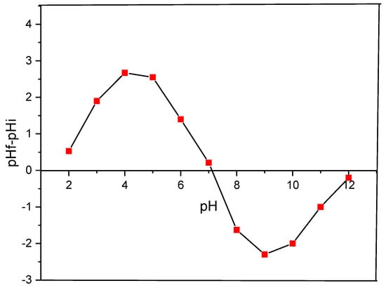 The pHpzc of Zygophyllum gaetulum stems was found to be 7.12 as shown in Figure 6. At a pH of the solution below the PZC (point of zero charge), the adsorbent surface acquires a positive charge due to the protonation of the acid groups present in the material. Simply expressed, the adsorbent surface becomes cationic, favoring the adsorption of anions. Conversely, when the pH of the solution exceeds the pH PZC, oxygen-containing acid groups on the surface are ionized or dissociated. In short, the adsorbent surface adopts an anionic charge, showing a preference for cation adsorption [44].