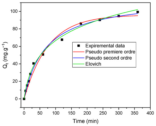 Non-linear fitting of kinetic models for the adsorption of C.I. Direct Black 80 dye on Zygophyllum gaetulum stems (C0 = 50 mg.L−1, T = 25 °C, V = 25 mL, adsorbent dosage = 20 g.L−1).