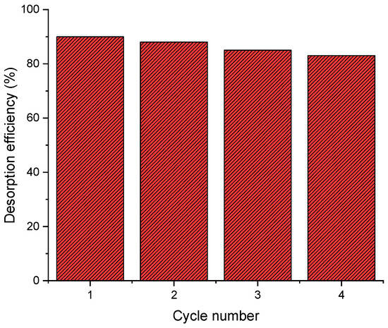 This process was repeated over several cycles to determine the adsorbent’s ability to be regenerated and reused. The concentration of dye in the desorption solution was measured by the UV/VIS spectrophotometer SP-UV1100 DLAB after each cycle to assess desorption efficiency. The % desorption (DE%) was calculated according to the following equation: