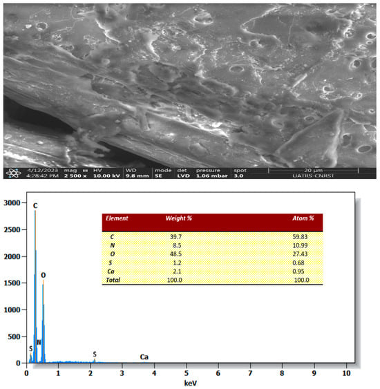 SEM images and EDX spectra of Zygophyllum gaetulum stem powder before adsorption.