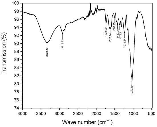 Figure 2 illustrates the FTIR analysis of Zygophyllum gaetulum stem powder before the adsorption of the C.I. Direct Black 80 dye. This provides a comprehensive understanding of its phytochemical composition, which primarily comprises lignin, cellulose, and hemicellulose. The broad band at 3331.36 cm−1 is attributed to hydroxyl stretching vibrations (-OH), which are characteristic of cellulose and hemicellulose due to their polysaccharide structures, as well as the hydroxyl groups present in lignin [37]. The peaks at 2917.44 cm−1 and 2850.06 cm−1 indicate the presence of aliphatic C-H stretching vibrations, in particular methyl (CH3) and methylene (CH2) groups, which are integral to the aliphatic chains of hemicellulose and the complex structure of lignin [38]. The small peak at 1732.29 cm−1 indicates the presence of carbonyl groups (C=O), typical of ketones and aldehydes present in hemicellulose and lignin [38,39]. In addition, the vibration observed at 1626.59 cm−1 suggests the presence of C=C bonds, which are indicative of unsaturated aromatic structures inherent to lignin. The bands at 1421.94 cm−1, 1371.94 cm−1, and 1317.38 cm−1 correspond to the C-H bending of alkyl groups, which are present in both the polysaccharide chains of cellulose and hemicellulose as well as in lignin. The peak lengths of 1237.63 cm−1 and 1031.44 cm−1 indicate C-O stretching vibrations, suggesting the presence of ether and alcohol groups. These groups are characteristic of both glycosidic bonds in cellulose and hemicellulose as well as ether bonds in lignin [40].