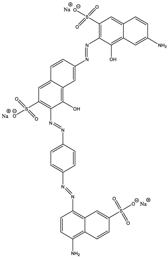 The importance of this problem is accentuated by the central role of water, an essential resource for life. As well as being a universal solvent, water regulates temperature, enables chemical reactions, and maintains biodiversity in ecosystems [8,9,10]. However, the contamination of water resources by textile dyes considerably reduces its availability, contributing to the global water crisis and directly threatening public health and the balance of ecosystems. The world currently has around four billion people under water stress, representing almost two-thirds of the world’s population [11]. Such dyes, which are chemical complex compounds, can enter water bodies through intentional discharges, inadequate treatment, or accidental spills [5,12].