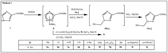 In our study, methyl 1-alkyloxymethyl-1,2,4-triazole-3-carboxylates 10a–j were prepared in two steps: first, we obtained the silyl derivatives of methyl 1,2,4-triazole-3-carboxylate 7 by its treatment with 1,1,1,1,3,3,3,3-hexamethyldisilazane (HMDS) followed by an addition of alkyloxymethylacetates 9a–j in the presence of Lewis acid tin tetrachloride (Figure 3). Compounds 9a–j were synthesized from dialkoxymethanes 14a–j [18], which in turn, were obtained by a known method [19]. In the case of 1-([2-hydroxyethoxy]methyl)-1,2,4-triazole-3-carboxamide 1c, compound 8 was treated with [2-(acetoxy)ethoxy]methyl acetate 9l [20] obtained from 1,3-dioxalane, the acetate protecting group of the ethyloxymethyl moiety that was removed by ammonolysis. Methyl 1-methoxymethyl-1,2,4-triazole-3-carboxylate 10a was isolated by column chromatography resulting in a 38.5% yield. The esters 10b–j were used at the next stage without further purification. The amides 11a–j were obtained by ammonolysis of the esters 10a–j (Figure 3) and were purified through recrystallization from an ethanol–ethyl acetate mixture in yields ranging from 34 to 91% (Table 2 shows the yield of compounds 11 out of 7 and the yield of 1c out of 7).