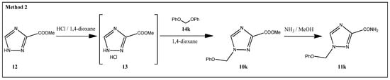 1-(Phenoxymethyl)-1,2,4-triazole-3-carboxamide 11k was prepared using diphenoxymethane 14k that was synthesized according to a procedure described in the literature [21]. Methyl 1,2,4-triazole-3-carboxylate hydrochloride 13 was treated with 14k to give the ester 1-(phenoxymethyl)-1,2,4-triazole-3-carboxylate 10k followed by its ammonolysis (Figure 4). Amide 11k was purified in a similar way to the previous amides 16a–j manner, resulting in a 52% yield.