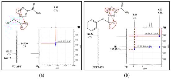 APT, DEPT-135 and 1H-13C HMBC NMR spectra fragments: (a) methyl 1-(methoxymethyl)-1,2,4-triazole-3-carboxylate and (b) 1-(phenoxymethyl)-1,2,4-triazole-3-carboxamide.
