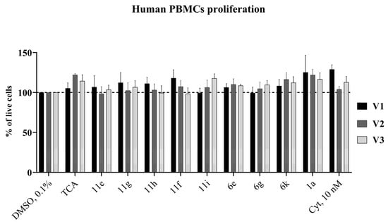 Effect of compounds on human PBMC proliferation. Cells were treated with the DMSO, Cyt, 1a or its derivatives for 72 h and then were counted using trypan blue exclusion test. V—volunteer. All data are expressed as percent of DMSO treated control. Significant differences were analyzed by the one-way ANOVA test.