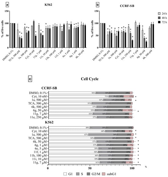 (a,b) Antiproliferative effects of compounds in CCRF-SB and K562 cancer cells. The cells were cultured with the solvent (DMSO), cytarabine (Cyt), or ribavirin (1a), or its derivatives. Cells were stained with trypan blue and counted after 24, 48 and 72 h of the treatment. (c) Effect of selected compounds on cell cycle progression in K562 and CCRF-CEM cells after 72 h of incubation with the DMSO, Cyt, 1a or its derivatives. Cells were fixed with ethanol and then stained with propidium iodide and analyzed by flow cytometry. All data are expressed as percent of DMSO treated control. Significant differences were analyzed by the one-way ANOVA test. *—significant differences from the control (p < 0.05).