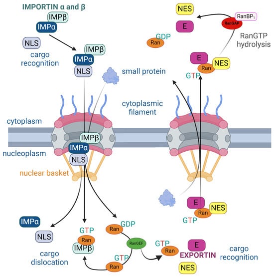 Structure of the nuclear pore complex (NPC) illustrating the unidirectional nuclear import and export of proteins regulated by the RanGTP cycle. On the left, nuclear import is facilitated by importins (IMP), which recognizes cargo with a nuclear localization signal (NLS) in the cytoplasm. Importins and bind to the NLS and carry the cargo through the NPC into the nucleus. Inside the nucleus, RanGTP binds to importin , causing cargo dislocation and its release into the nucleoplasm. On the right, nuclear export involves exportin (E), which recognizes cargo containing a nuclear export signal (NES). Exportin binds to both the NES and RanGTP to facilitate export through the NPC. Once in the cytoplasm, RanGTP is hydrolyzed to RanGDP by RanGAP and RanBP1, causing the release of the cargo into the cytoplasm. The cycle is maintained by RanGEF, which facilitates the conversion of RanGDP to RanGTP inside the nucleus. The arrows represent the direction of protein movement, the progression of complex formation and disassembly, and the key interactions in nuclear transport [].