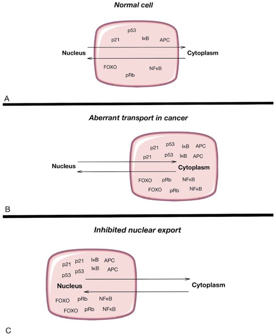 Nucleoplasmic transport in normal cells (A) and cancer cells (B), and the inhibition of nuclear export (C). The pink rectangle highlights the cell structure, with the upper section representing the nucleus and the lower section representing the cytoplasm, illustrating the location and movement of key proteins involved in nucleocytoplasmic transport. Arrows represent the movement of different proteins between the nucleus and the cytoplasm of a cell [].