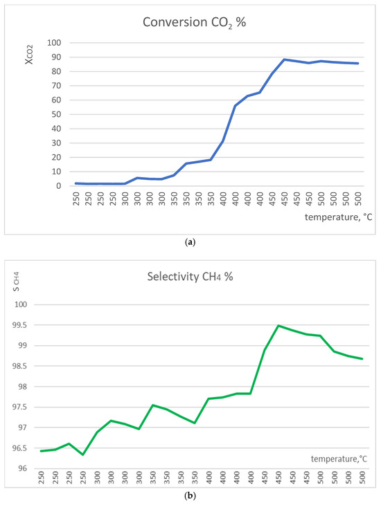 The best conversion CO2 (88.35%) and selectivity CH4 (99.49%) were found for this catalyst at 450 °C. This temperature was chosen as optimal for all catalytic tests that were conducted. A comparison of the obtained values of conversion and selectivity with equilibrium values is presented in Figure S1.