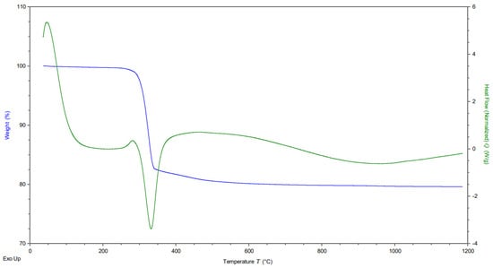 Nickel hydroxides prepared by the solvothermal method were calcinated after separation and purification to remove the residue of water after the drying process and to obtain a stable crystal structure of the oxide for catalytic application. The optimal calcination temperature was obtained from the thermal analysis conducted with sample Ni(OH)2, synthesized in conditions corresponding to the preparation of the NiOnd sample, which was used as a reference sample for this purpose. The temperature range of the analysis was 40–1200 °C (Figure 2). As can be seen on the DSC graph, the phase transformation occurs once, at about 340 degrees. The TG graph demonstrates that the sample lost about 20% of its initial mass at this temperature. XRD measurement confirmed that Ni(OH)2 was originally prepared and transformed into NiO by the described method. The analysis data correspond to the stoichiometric equation of the thermal decomposition of nickel hydroxide: