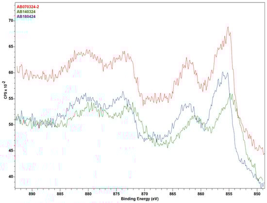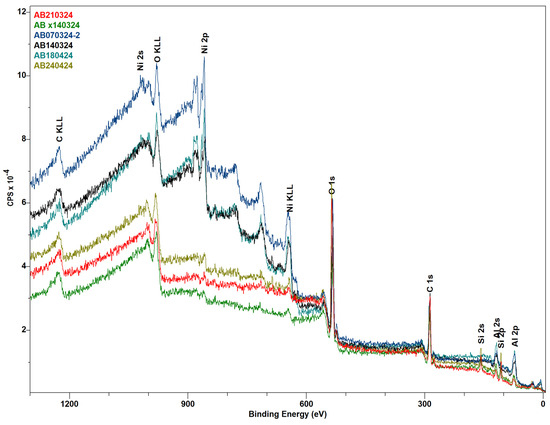 As can be seen in Figure 6 and Table 3, the XPS analysis indicated that the post-catalysis samples show small (detection-limit-adjacent) nickel content, which might stem from leaching of the metal during the reaction or, more likely, the buildup of a (mostly carbon and oxygen) “coating” on the catalyst (info depth of XPS is 5–10 nm). Really, significant differences in the spectra of all three samples, which can clarify differences in their catalytic activity, were observed after the subtraction of SiO2 content, which was used as an anti-sintering agent in a mixture with active catalysts. Unfortunately, the dilution of the catalysts in this inert material did not allow for the measurement of Ni’s high-resolution spectra for samples after catalysis.