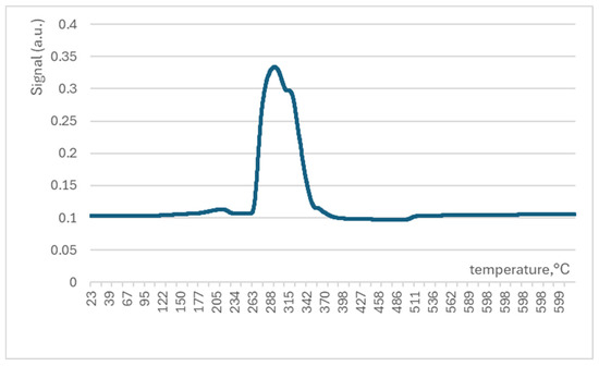 The TPR experiment for sample NiOhx2 is presented in Figure 7, where it is possible to see the features of the interaction of nickel oxide with hydrogen. A single peak indicates the reduction of nickel oxide to pure nickel at about 300 °C. Notably, all catalysts were activated at this temperature. Therefore, reduced nickel can be supposed as the starting form of the catalyst in the reactor during the catalytic stability study.