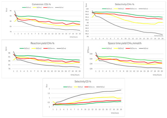 In all cases, the selectivity of unwanted product CO (sCO) increased slightly during catalysis (from 0 to 2%). The largest increase was found for the sample NiOnd—from 0.1 (t = 1 h) to 1.9% (t = 20 h). In the remaining samples, the maximum value of sCO at the end of the experiment was insignificant (less than 1%)