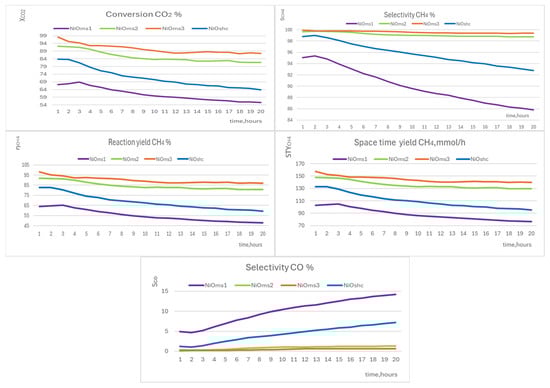 The selectivity of CH4 production goes down almost linearly for both of the worst catalysts, NiOms1 (from 95.3 to 85.8%) and NiOshc (from 98.8 to 92.8%). The other two catalysts showed more stable selectivity for the production of CH4; it decreased for NiOms2 from 99.7 (t = 1 h) to 98.7% (t = 20 h) and for NiOms3 from 99.9 (t = 1 h) to 99.4% (t = 20 h). Therefore, they could be selected as the best from all the studied catalysts not only from the point of view of the selectivity production of methane but also from the point of view of values (see below).