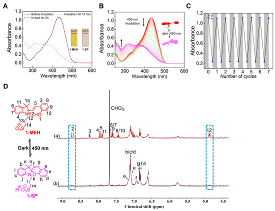 A solution of 1-MEH in CHCl3/CH3CN (1:1, v/v) (5 × 10−5 M) produces a yellowish solution which absorbs at λmax = 435 nm in UV–vis absorption spectra (Figure 2A). This absorbance is similar to that observed for the analog of merocyanine bearing a butyl sulfonate group on the nitrogen of the indoline moiety in polar solvents such as acetone and water [42,43]. When exposed to visible light (450 nm), the absorption intensity of 1-MEH diminishes to its minimum in about 10 min and is regenerated again to its original value under dark in about 2 h (Figure 2B), demonstrating its complete reversibility. During light irradiation, an absorption at 245 nm appears, accompanied by the fading of the color of the solution, indicating the formation of the ring-closing isomer 1-SP along with the release of a proton to the solution. In the mixed solvent system selected, the phototransformation and thermal relaxation of 1-MEH/1-SP were highly reversible for seven cycles without any detectable fatigue (Figure 2C). The photoisomerization of 1-MEH was examined by 1H NMR spectroscopy in CHCl3/CH3CN (1:1, v/v). The spectra revealed the presence of 1-SP as the major product, with a sample solution being subject to exhaustive irradiation at 450 nm, suggesting the transformation from 1-MEH to 1-SP under this condition (Figure 2D). Such a result is consistent with the report from the literature [44].