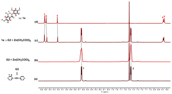 Stacked 1H NMR spectra (400 MHz, CDCl3/CD3CN, 1:1, v/v, 298 K) of (a) G2 (1.0 mM); (b) G2 (1.0 mM) and Zn(CH3COO)2 (2.0 mM); (c) 1a (2.0 mM) and G2 (1.0 mM) and Zn(CH3COO)2 (2.0 mM); (d) 1a (1.0 mM).