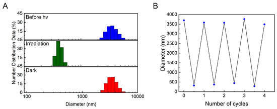 Interestingly, under dark conditions for 240 min, the assemblies increase to the size with the Dh of 3.60 μm (Figure 6A (dark)), indicating the reversibility of the assembly process. The present system works better in four interconvertible assembly–disassembly cycles, as shown by DLS measurement (Figure 6B). It should be noted that disassembly only proceeds to some extent, as indicated by the difference in size change before irradiation and after being kept in the dark, which is consistent with the results from TEM experiments.