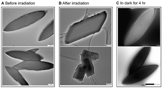 TEM images of the polypseudorotaxane 2 without irradiation reveal a nano-rhombus suprastructure (Figure 7A) but change into a nano-lamellar suprastructure upon irradiation for 10 min (Figure 7B). When placed in the dark, it returns to the original morphology (Figure 7C).
