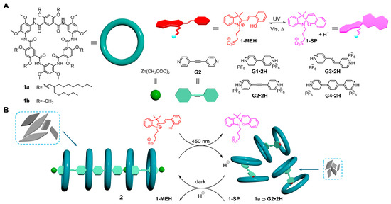 Bipyridinium salts and their derivatives (e.g., viologen) are known to be excellent guests and well-recognized building units by coupling to macrocycles in supramolecular chemistry [34,35,36,37]. These guests feature reversible protonation (or deprotonation) due to the presence of two N-donor atoms that enable association and dissociation of the host–guest complexes through a chemically controlled acid–base reaction. Here, we describe a non-photoresponsive system that demonstrates the light-controlled reversible change in self-assembly of a supramolecular structure generated from polypseudorotaxane 2 in the presence of a photoacid (1-MEH). This is realized by subjecting dipyridinyl acetylene (G2)-zinc complex and macrocycle 1a to protonation and deprotonation induced by 1-MEH under light irradiation, and the transformation of nano-rhombus to nano-lamellar suprastructures can be reversibly controlled with the photoacid via light-induced proton transfer (Scheme 1). The controlled self-assembly is evidenced by nuclear magnetic resonance (NMR), ultraviolet–visible (UV–vis) spectroscopy, dynamic light scattering (DLS), Fourier transform infrared (FT-IR) spectroscopy, and transmission electron microscopy (TEM).