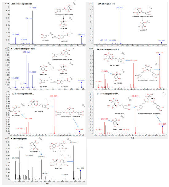 The MS/MS spectra of neochlorogenic acid (A), chlorogenic acid (B), cryptochlorogenic acid (C), isochlorogenic acid B (D), isochlorogenic acid A (E), isochlorogenic acid C (F), and secoxyloganin (G), and the corresponding characteristic ions and fragmentation pathways.