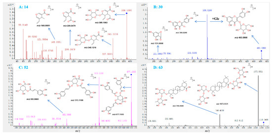 The identification of compounds 14 (A), 30 (B), 52 (C), and 63 (D) according to their MS/MS spectra and the corresponding characteristic fragment ions.