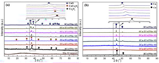 Fabricating the precursor containing Cu and Co was the main route to form CuCo alloy particles as these two species were restrained into atom level [15,25,32,33,34,35,36,37]. The catalytic performance of CuCo alloy particles derived from various precursors is shown in Table 2. Zhao et al. [38] prepared a series of Mn-Al-supported CuCo catalysts with different Cu/Co ratios. Based on the characterization results (Figure 1), the dominant phase was the CuCo2O4 after calcination, and the uniformly CuCo alloy particles were obtained after reduction. Cao et al. [39] studied the catalytic performance of CuCo catalysts derived from layered double hydroxides (LDHs. The characterization results indicated that CuCo mixed oxides were reduced to form CuCo alloys, and the synergistic catalytic effect between Cu and Co in the alloy promoted the formation of HA. Li et al. [25] prepared a series of CuCo catalysts with different Co/Cu ratios encapsulated in KIT-6. After the stepwise pyrolysis, the results indicated that Co and Cu species were anchored into CuxCo3−xO4 spinel oxide and the alloy phase was formed after reduction. The CuCo alloy particles were responsible for HA synthesis as a linear relationship between the surface proportion of alloy and yields of HA was displayed.