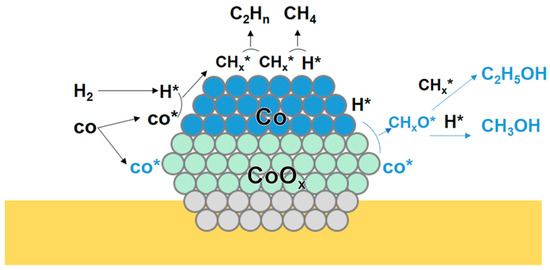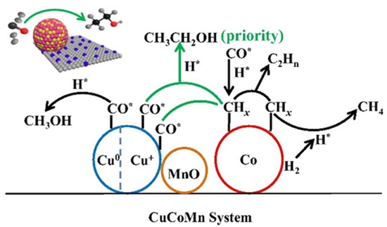 Sun et al. [49] applied Cu-Co-Mn catalysts in HA synthesis and observed significant alcohol selectivity (46.2%) and ethanol fraction (45.4%). The characterization results indicated that the Cu+ species existed on the catalyst owing to the strong interaction between Mn and Cu. They concluded that the outstanding performance was attributed to Cu+ species, which provided the absorbed CO was easier to participate in the CO insertion process than Cu0 [52,53]. They proposed that the synergistic effect between Cu+ and Co0 was responsible for ethanol formation (Figure 2).