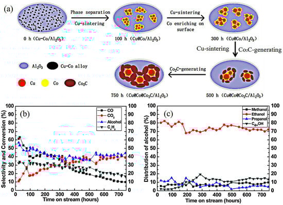 As mentioned above, the active sites on the CuCo catalysts were complex. Research focused on stability studies found that the active sites were not stable during the reaction [85,86,87,88]. The Cu and Co showed poor miscibility in the Cu–Co alloys. Furthermore, the lower surface energy of Cu (1.934 J M2) than Co that of cobalt (2.709 J M2) could result in preferential localization of copper on the particle surface. Yang et al. [86] investigated the structure evolution of CuCo alloy particles in HA synthesis during 800 h (Figure 4). The characterization results show that the alloy particles decomposed into Cu and Co species at the beginning of the reaction (100 h). The core–shell particles gradually formed during 100–300 h. As the reaction continued, the sintering of Cu enlarged the size of the Cu@Co particles. Meanwhile, the Co2C was formed owing to the carbonization of Co. In 500–750 h, the Cu and Co NPs were wrapped by Co2C. The significant deactivation of catalytic performance was also observed in Figure 4b,c. Consequently, the transformation of the active sites during the reaction was the main reason for the poor stability of CuCo catalysts.