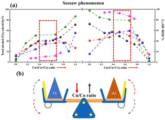 Catalytic performance of CuCo catalysts varying Cu/Co ratio. (a) Catalytic performance of CuCo catalysts varying Cu/Co ratio, (b) Schematic diagram of “Seesaw” phenomenon. (Note: the red and black arrow in (b) represents the decrease and increase in Cu/Co ratio, respectively).