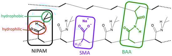 Structure of the tested polymer adsorbents (crosslinked PNIPAM-co-PolySMA), with highlighted monomeric units: NIPAM (the main monomer), responsible for LCST (T-induced switching between hydrophilic and hydrophobic state); SMA co-monomer responsible for swelling sensitivity to pH, which also means pH-dependent charge; BAA co-monomer incorporated as a crosslinker.