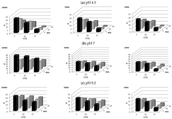 The trend in the Q values reported above for pH 4.5 and 7 was also preserved for pH 9.2 (Figure 2c), but despite the complete dissociation of the SMA moiety, Q took values lower than for pH 7 and similar to those measured for pH 4.5. In strongly alkaline media, the effects of condensation of counterions and charge screening with excess Na+ ions cause suppression of polyelectrolyte swelling [59,60]. Therefore, the degree of hydrogel swelling measured at pH 9.2 was lower than at pH 7 but higher than in more acidic solutions at pH 4.5. Similarly to pH 7, the swelling degree of the SMA-rich hydrogels (10SMA) showed at pH 9.2 very small temperature sensitivity.