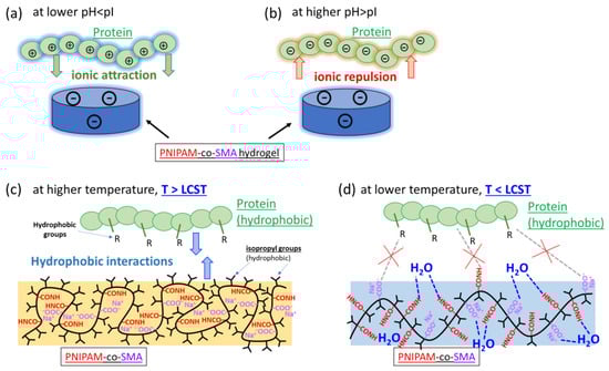 Cartoon representation of interactions between a protein and hydrogel (a) at a lower pH, (b) at a higher pH, (c) at a higher temperature (T > LCST), and (d) at a lower temperature.