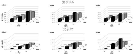 From Figure 4a, it can be observed that although BSA with pI = 4.7 was only slightly positively charged at pH 4.5, its adsorption on the hydrogels was possible. The adsorption became more prominent with the increasing SMA content, which indicated the occurrence of ionic interactions between the protein and the hydrogel surface. The adsorption strength decreased with increasing BAA content; an increase in the crosslinking density caused a higher surface concentration of the ionized SMA groups, which reduced the hydrophobic interaction of the protein with the hydrogel. However, an advantage of the increase in the crosslinker content was the increasing rigidity of the polymer, which improved its mechanical stability. The adsorption strength increased with increasing temperature (T > LCST), which activated hydrophobic interactions between the hydrophobic patches on the protein surface and the hydrophobic groups of the hydrogels.