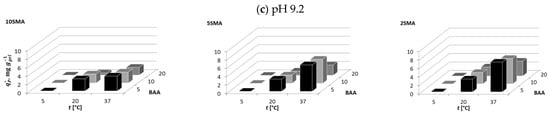 Analogous trends were observed for pH 9.2 like at pH 7: very weak adsorption of BSA, small effect of the SMA content, slight enhancement of adsorption with increasing temperature, and lack of adsorption at 5 °C (Figure 4c).