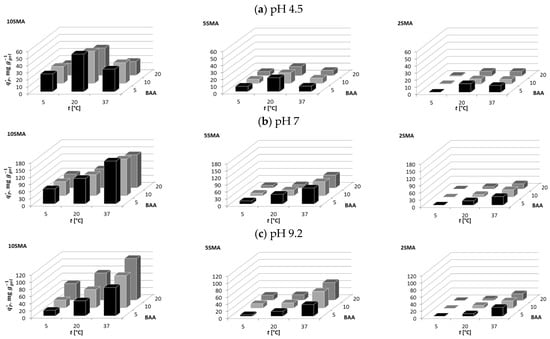 For all pH conditions tested (4.5, 7, 9.2), the molecules of LYZ were positively charged (Table 2), therefore they could be attracted by ionized (partly or fully deprotonated) SMA groups on the surface of the hydrogels surface (the hydrogels’ surface was always negative under the mentioned pH conditions). The adsorption pattern in terms of the adsorbed phase concentration is visualized in Figure 5, and the exact data are presented in Table S4 in the Supplementary Materials.