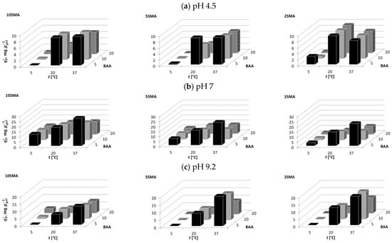At pH 4.5, the molecules of BSA were positively charged to a small extent (Table 2); therefore, they could be attracted by the PNIPAM-co-PolySMA hydrogels that were negatively charged (Table 2). As will be discussed below, the hydrophobic interactions between the hydrogels and the proteins additionally proved to be the second key factor in the adsorption tests. The dependencies of the adsorption affinity of BSA on temperature and the PNIPAM-co-PolySMA composition, i.e., on the content of SMA and BAA, are illustrated in Figure 4, while the exact data are presented in Table S2 in Supplementary Materials.