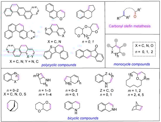 In this up-to-date review, we summarize the cyclization strategies in carbonyl–olefin metathesis, dividing them into three categories (Figure 2): (1) the formation of monocyclic compounds; (2) the formation of bicyclic compounds; and (3) the formation of polycyclic compounds.