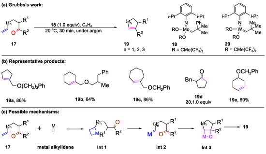 The earliest reported instance of a carbonyl–olefin metathesis cyclization reaction, catalyzed by a metal to yield five-membered ring scaffolds, dates back to Grubbs’ work in 1993 [47]. When an olefinic ketone 17 served as the substrate, intramolecular cyclization between the olefin and carbonyl functional group occurred, with the aid of stoichiometric amounts of molybdenum alkylidene 18, yielding the cycloalkene 19 using benzene as a solvent (Scheme 1). This approach showcased a versatile substrate scope, enabling the synthesis of diverse unsaturated five-, six-, and seven-membered rings (19a–19c) in good yields. Notably, the carbonyl–olefin metathesis of olefinic ketone 17, featuring α-oxygenation, leads to the formation of cyclic ketone 19d via the isomerization of the cyclic enol ether intermediate, facilitated by 20 (1.0 equiv). Interestingly, 19e bearing an ester functional group could be obtained from functionalized diene as the starting material, utilizing 2 mol% of 18. Drawing from previous studies [48,49], the author hypothesized that the olefin metathesis between olefinic ketone 17 and 18 generated a new alkylidene intermediate, Int 2, containing a carbonyl group, which subsequently underwent intramolecular carbonyl olefination, mediated by metal quaternary ring intermediate Int 3, to produce cycloalkene 19.