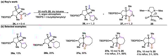Inspired by previous work, Roy and colleagues developed a Grubbs–II 25-catalyzed ring-closing carbonyl–olefin metathesis and ring-closing olefin metathesis protocol for the synthesis of unsaturated carbocyclic compounds 26 and 27 (Scheme 3) [51]. When n = 3 in 24, the carbonyl–olefin metathesis product 26a and olefin metathesis product 27a were observed. When n = 4 in 24, only the ring-closing carbonyl–olefin metathesis product 26b was formed in a moderate yield of 20%. In addition, for 24 with n < 4, the olefin metathesis proceeded efficiently using 10 mol% Grubbs-II 25 under reflux conditions, providing a series of bicyclic frameworks, including five–seven (27b) and five–six (27c), in high yields. Further experimental studies have revealed that increasing the loading of 25 favored the ring-closing carbonyl–olefin metathesis of 26.