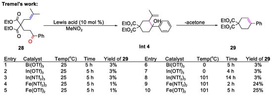 Later, Duñach’s group reported a Lewis acid-catalyzed intramolecular carbonyl–olefin ring-closing process of phenyl ketone 28, giving cyclohexene 29 (Scheme 4) [52]. Further ESI-MS analysis revealed that the dehydration of the tertiary alcohol Int 4 served as the primary side reaction, contributing to the reduced yield of 29. Conditional screening experiments have demonstrated that Fe(NTf2)2 has potential for promoting the metathesis of carbonyl olefin.