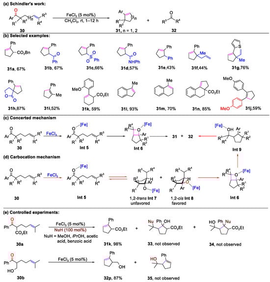 Despite the well-established metal-catalyzed carbonyl olefin metathesis reaction, its application has been hindered by the necessity of stoichiometric transition metals or harsh reaction conditions [24,53]. In 2016, Schindler’s group overcame this limitation by demonstrating a catalytic FeCl3-mediated carbonyl–olefin ring-closing metathesis reaction that efficiently prepared unsaturated carbocyclic olefin in moderate to excellent yields (Scheme 5) [54]. This process used aromatic β-ketoester 30 with a pendant isoprenyl group as a substrate, under mild conditions, facilitating advances in olefin metathesis research. The reaction exhibited high functional group tolerance and a wide substrate scope, ena-bling the conversion of variously substituted aromatic β-ketoesters into the cyclopentene product. Notably, various β-substitutions, including a benzyl ester, ketone, sulfonyl, and amide, were compatible, providing cyclopentenes 31a–31h with up to 87% efficiency. For methyl or p-phenyl methoxy substitution, only thermodynamically stable product 31i was observed. Remarkably, spirocyclic motif 31h, six-membered carbocycle 31k, indene 31l, 1,2-dihydronaphthalene 31m, and tricyclic 31n could also be efficiently synthesized through this carbonyl–olefin metathesis. Based on their findings, Schindler and colleagues proposed two potential mechanisms: a concerted mechanism involving [2+2] cycloaddition and cycloreversion (Scheme 5c) and a carbocation mechanism featuring nucleophilic attack and carbocation trapping (Scheme 5d). Further experiments revealed the absence of a carbocation intermediate, supporting the concerted mechanism (Scheme 5e).