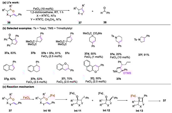 Concurrently, Li and co-workers disclosed an efficient FeCl3-catalyzed ring-closing carbonyl–olefin metathesis using 1,2-dichloroethane (DCE) as a solvent (Scheme 6) [55]. This method could provide cyclopentene 37a, cyclohexene 37d, tetrahydropyridine 37e, 2,5-dihydro-pyrrole 37f, indene 37g, 1,4-dihydronaphthalene 37h, and 2,5-dihydro-1H-pyrrole 37i, with good yields using 1–20 mol% FeCl3. Notably, allyl trimethyl silane facilitated key oxetane intermediate formation and benzaldehyde scavenging, which are crucial for the synthesis of five-membered nitrogen heterocycle 37f. The presence of minor side product 37k led to the proposal of a stepwise mechanism (Scheme 6c) [56,57], involving electrophilic cyclization, [2+2] cycloreversion, and FeCl3 regeneration.