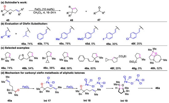 - Ludwig, J.R.; Zimmerman, P.M.; Gianino, J.B.; Schindler, C.S. Iron(III)-catalysed carbonyl-olefin metathesis. Nature 2016, 533, 374–379. [Google Scholar] [CrossRef] [PubMed]