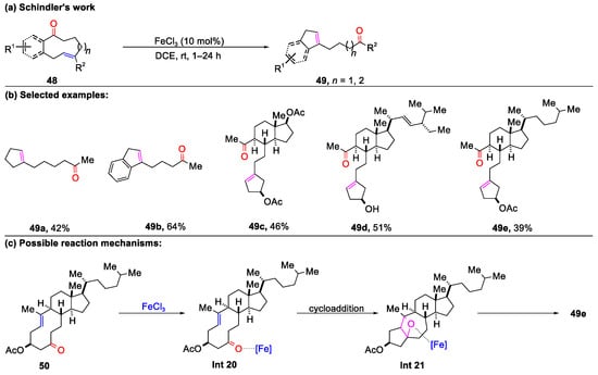In the same year, it was reported that polycyclic substrate 48 underwent a transan-nular carbonyl–olefin metathesis process, catalyzed by FeCl3, to afford multi-substituted cyclopentadiene derivative 49 (Scheme 9) [29]. This conversion was effective for a variety of 9- and 10-membered ring systems, affording the desired metathesis products 49a–49e in moderate yields. Notably, both carbonyl-ene and carbonyl–olefin metathesis pathways competed under FeCl3 catalysis, with metathesis prevailing as the thermodynamic product. Importantly, this transformation revealed that either a transannular carbonyl-ene product or carbonyl–olefin metathesis product could be furnished, utilizing a distinct Lewis acid catalyst [61]. Further mechanistic studies indicated that the retro-[2+2]-cycloaddition of Int 21, formed via a unique reaction pathway involving Int 20, offered the expected transannular carbonyl–olefin metathesis product 49e.